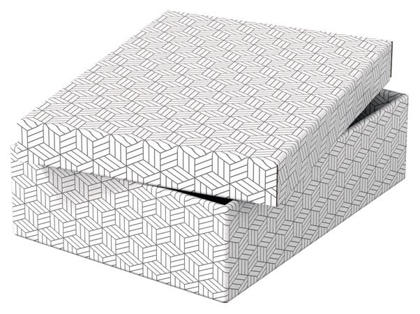Súprava troch stredných lepenkových úložných boxov s moderným a štýlovým geometrickým dizajnom.