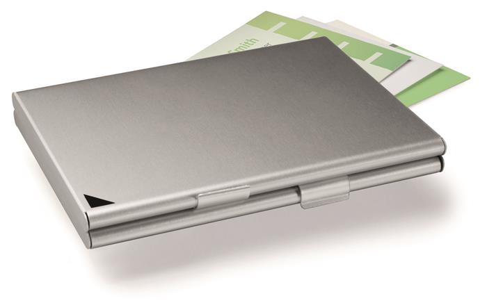 Elegantné hliníkové puzdro na vizitky s matným strieborným povrchom.