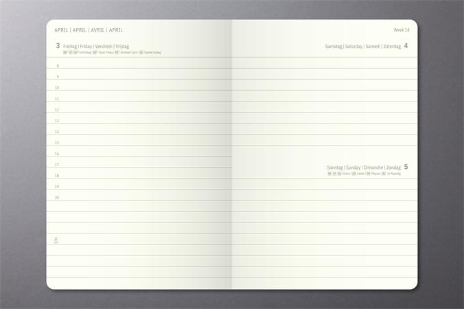 -denné rozvrhnutie (1 strana = 1 deň; sobota/nedeľa spolu na jednej strane) -mesačný a ročný plánovač na roky 2026/2027 -gumička na uzatváranie -držiak na pero na bočnej strane -vnútorné rohové vrecko a archivačné púzdro -s označovacou páskou -s mapou sveta - s tabuľkou veľkostí - papier chamois, 80 g/m² -v zadnej časti perforované  listy na poznámky -s nálepkami -rozmery: 108x151x30 mm -jazyk: DE/ENG/FR/NL