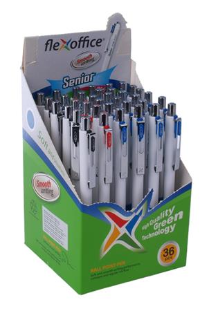 Guľôčkové pero, 0,4 mm, stláčací mechanizmus, rôzne farby tela, FLEXOFFICE "Senior", modré