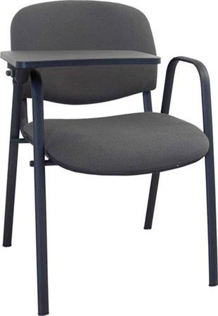 Čierna stolička s oceľovým rámom a opierkami na ruky, s vyklápacím plastovým stolíkom pre pravákov. Operadlo s 25 mm penou, sedadlo s 30 mm penou, panel operadla a sedadla z vrstvenej preglejky, plastový kryt sedadla. Stohovateľná.