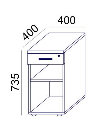 Úložný prvok má výšku rovnakú ako písacie stoly, s jednou drevenou zásuvkou a jednou poličkou.