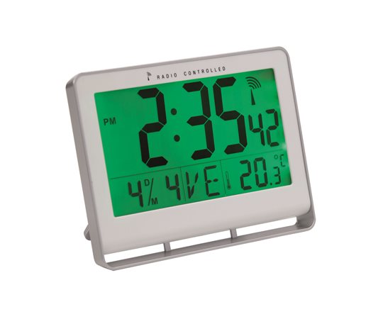 hodiny riadené rádiovým signálom, veľký LCD displej: 17 x 9 cm, automatické nastavenie času, indikácia času, kalendára, teploty, dá sa zavesiť na stenu alebo postaviť na stôl, fungujú s 1x LR6/AA batériou (nie je súčasťou balenia)