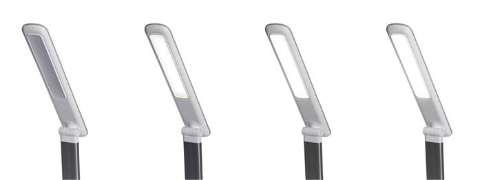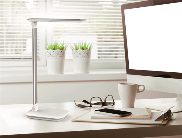 Lampa s integrovaným USB typu A na nabíjanie smartfónu a 5-stupňovým stmievačom s dotykovou funkciou na základni svietidla. Energeticky úsporná trieda „A“ (spektrá A++ - E) s 24 LED žiarovkami bez možnosti ich výmeny so životnosťou 20 000 hodín s teplým bielym svetlom 3 000 °K. Svietivosť 2 060 lx pri vzdialenosti 35 cm od stola, svetelný tok 410 lúmenov, extrémne nízka spotreba energie cca 8 kWh / 1 000 h. Sklopná a otočná svetelná hlavica 26 × 5 cm, stabilný podstavec 18 × 13 cm so závažím a podložkou proti poškodeniu dosky stola. Rameno z eloxovaného hliníka, dĺžka 36,5 cm, výška normálnej pracovnej pozície 41 cm, dĺžka kábla 1,8 m.