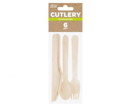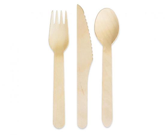 Sada drevených príborov obsahuje: 2 vidličky, 2 lyžice, 2 nože