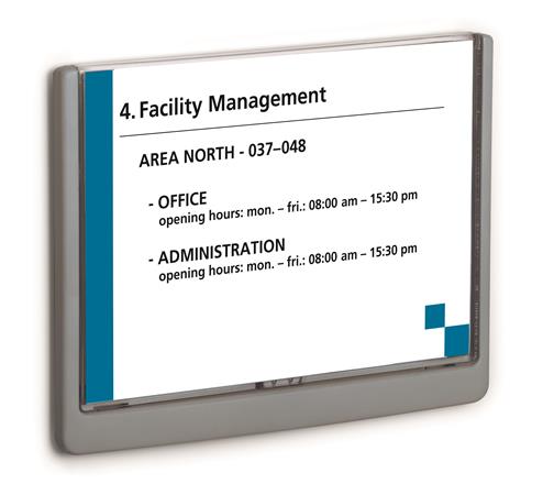 Hlavná stránkaPrevádzka a údržbaPrevádzka a údržbaInformačné znakyInformačná tabuľka, 148,5x210 mm, DURABLE "CLICK SIGN", sivá