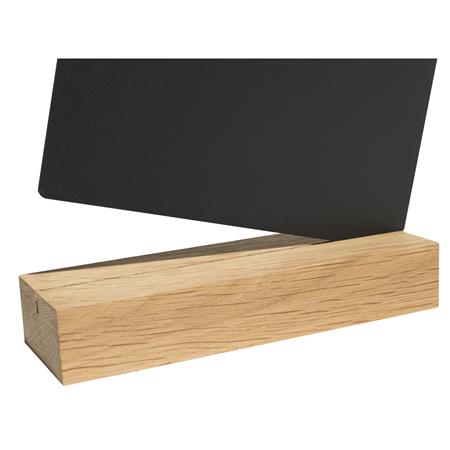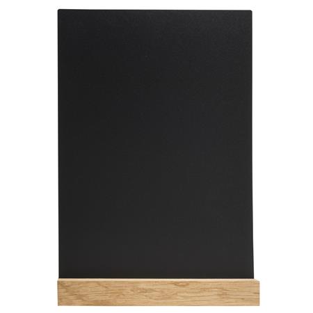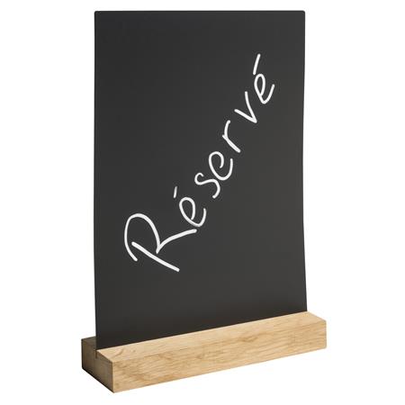 Ideálny na vystavenie jedálnych lístkov, cien či ponúk na stole. -vyrobený z ABS plastu -vhodný na písanie kriedou alebo kriedovým popisovačom -obojstranný -zvislá orientácia -podstavec z dubového dreva -rozmery: 210 x 52 x 297 mm