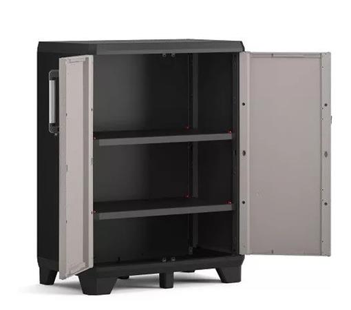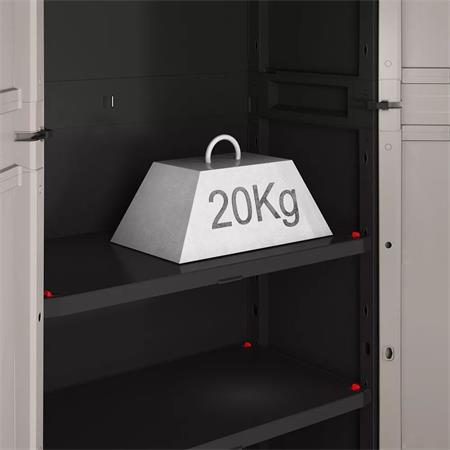 Odolná plastová  skriňa vhodná do garáže, na chatu, na terasu alebo do pivnince. - jednoduchá montáž a údržba - dvere uzamykateľné visiacim zámkom (nie je súčasťou balenia) - 2 nastaviteľné police s nosnosťou 20 kg/polica - nastaviteľné nôžky - s certifikátom TUV GS minősítéssel -rozmery skrine: 68x39x90 cm (šírka x hĺbka x výška) - rozmery políc: 63x33 cm - celková hmotnosť: 9 kg