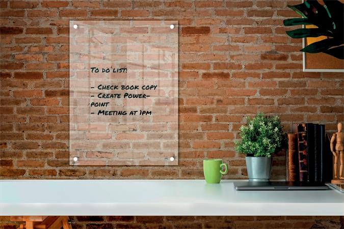Mini tabuľa s moderným, bezrámovým dizajnom, pre domáce a kancelárske použitie, na písanie poznámok, zapisovanie myšlienok, nápadov alebo dôležitých dátumov. Cez rohy sa dá namontovať na stenu a vďaka priehľadnému dizajnu nepozorovane zapadne do okolia, keď sa nepoužíva. Ľahko čistiteľný povrch; stačí naň napísať a zmazať. - dá sa nasucho stierať - príslušenstvo: 1 popisovač na tabule - rozmer: 600x450 mm - možno inštalovať vertikálne alebo horizontálne - záruka 1 rok na povrch